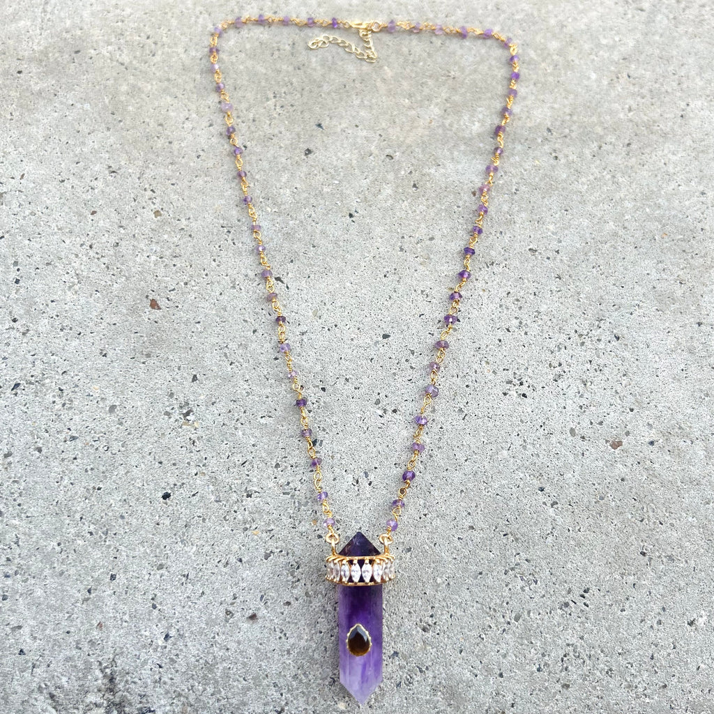 This necklace features a faceted Amethyst pendant accented with clear zircon stones, with a Garnet set at the center.