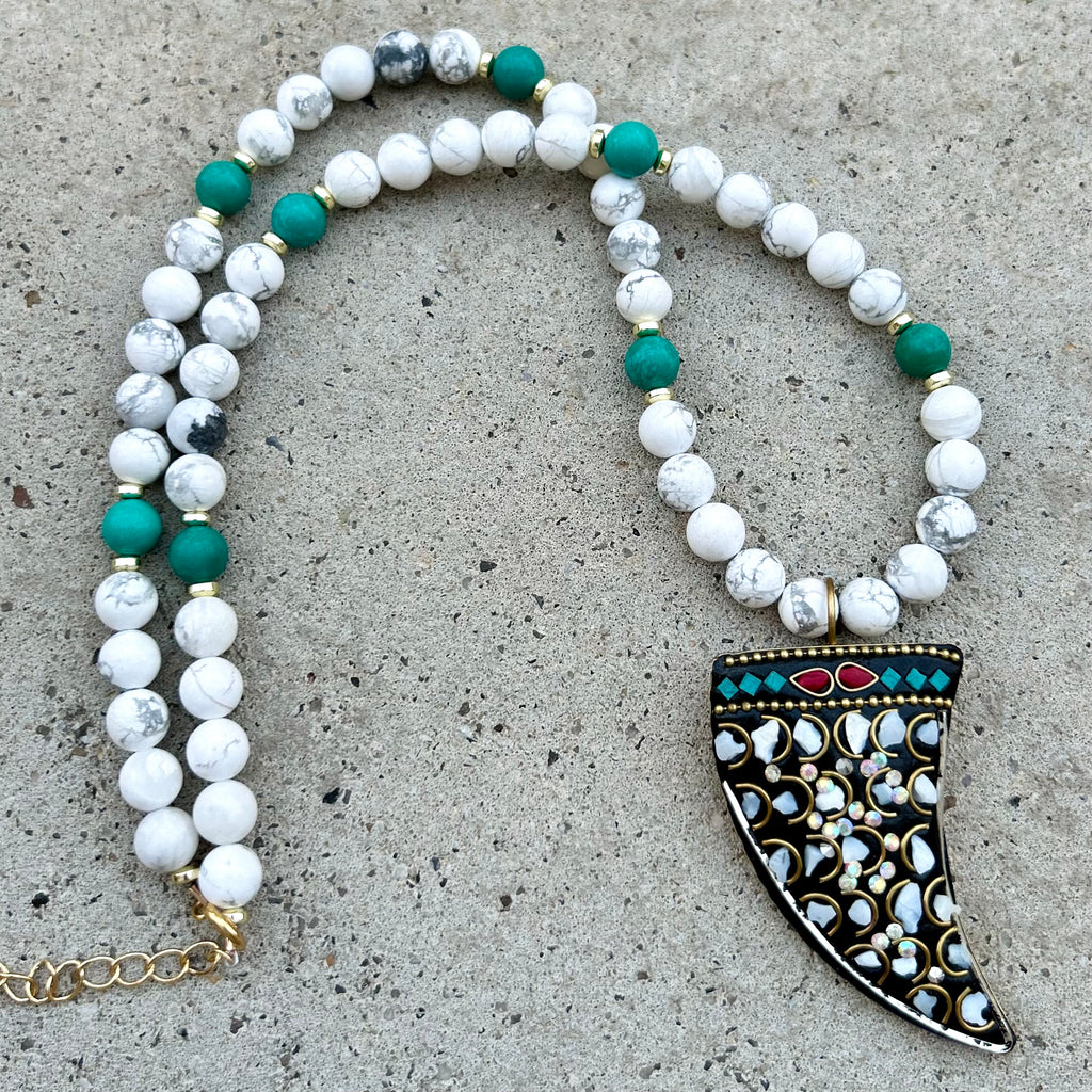 This necklace is made with 6/8mm faceted round White Howlite & Turquoise beads and Hematite with handmade tusk.