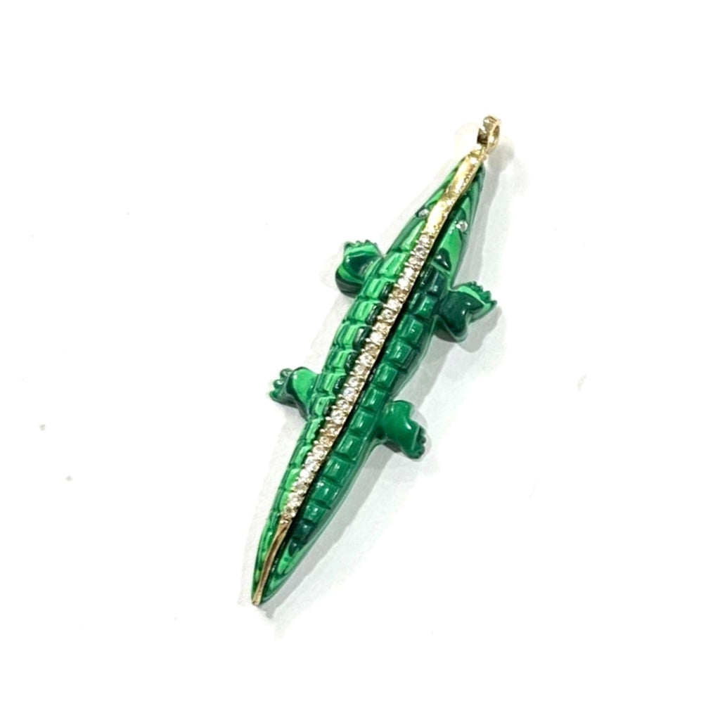 This necklace features a crocodile-shaped pendant carved from Malachite accented with a central line of clear zircon stones, as well a small one on each side for the eye.