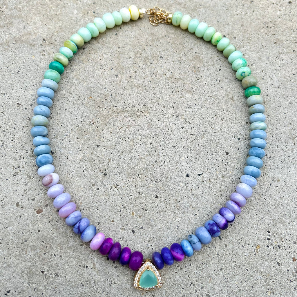 This Necklace is hand-made with polished Opal rondelles, 22k Gold Plated & Aqua Chalcedony center piece