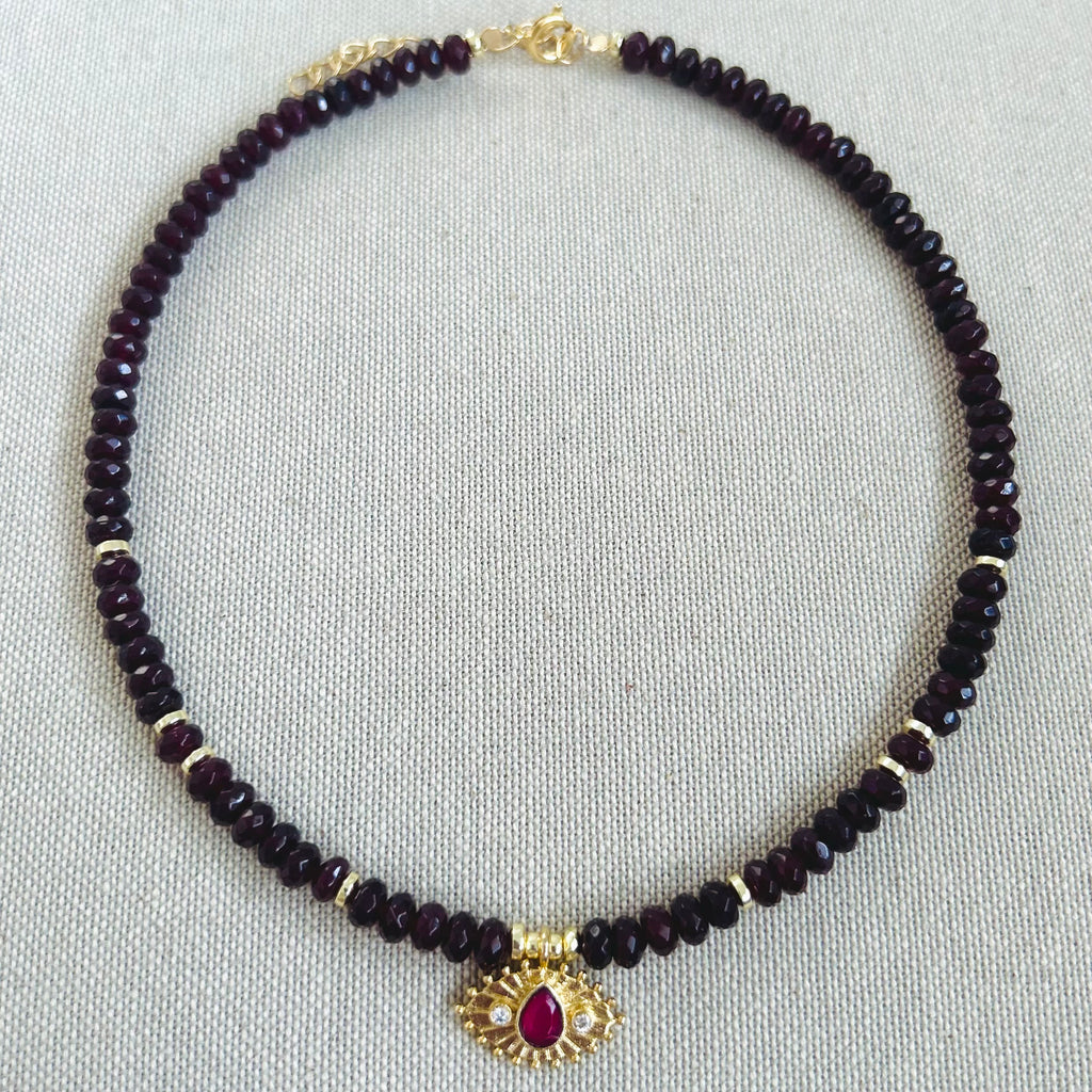 This Necklace is hand-made with Deep Red Jade faceted rondelles, 14k Gold Plated Brass Eye Pendant with a faceted oval Red Agate at the center and 2 bezel zirconium on each side.