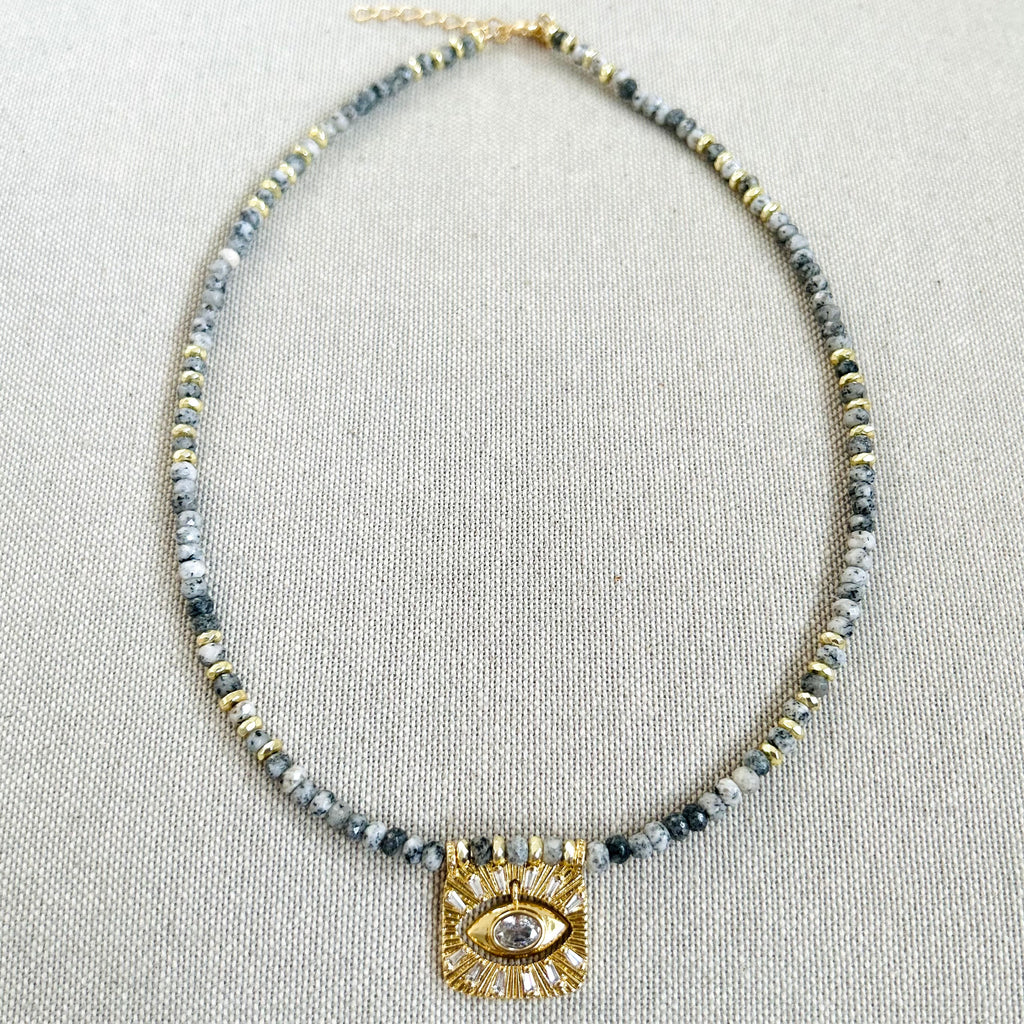 This Necklace is hand-made with 4mm Faceted Light Pink Jade Rondelles, 14k Gold Plated Hematite, 14k Gold Plated Square Eye Pendant with 12 delicate clear cubic Zirconium baguettes and and oval faceted one at the center of the eye.