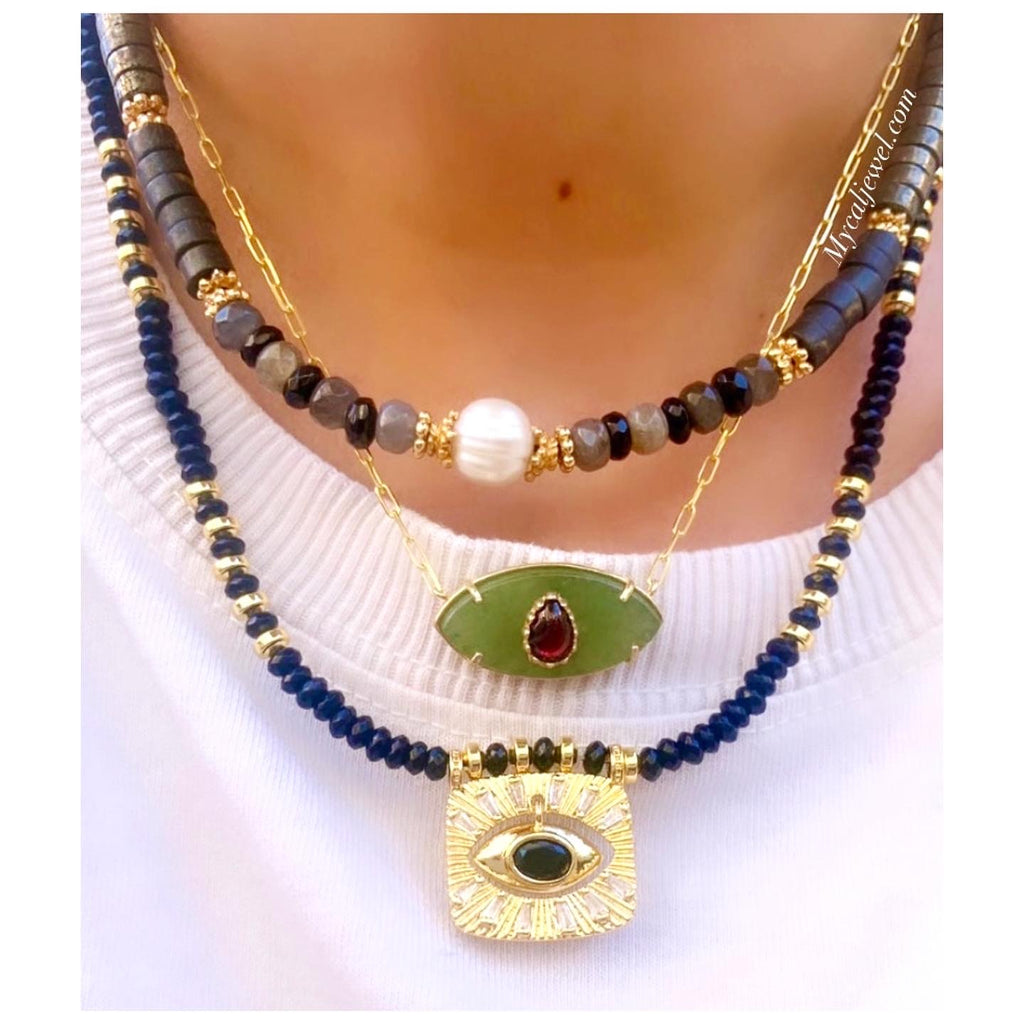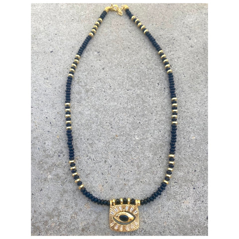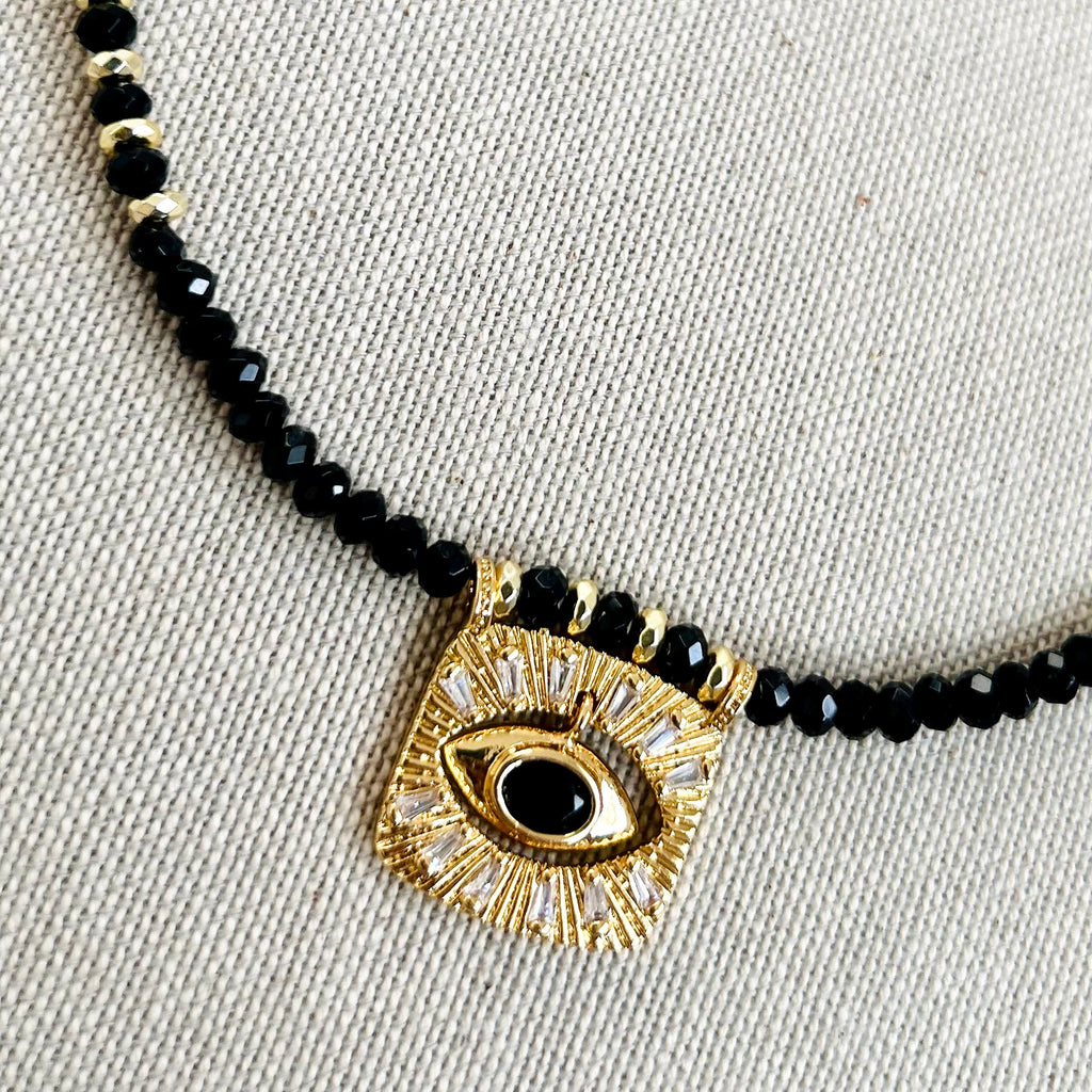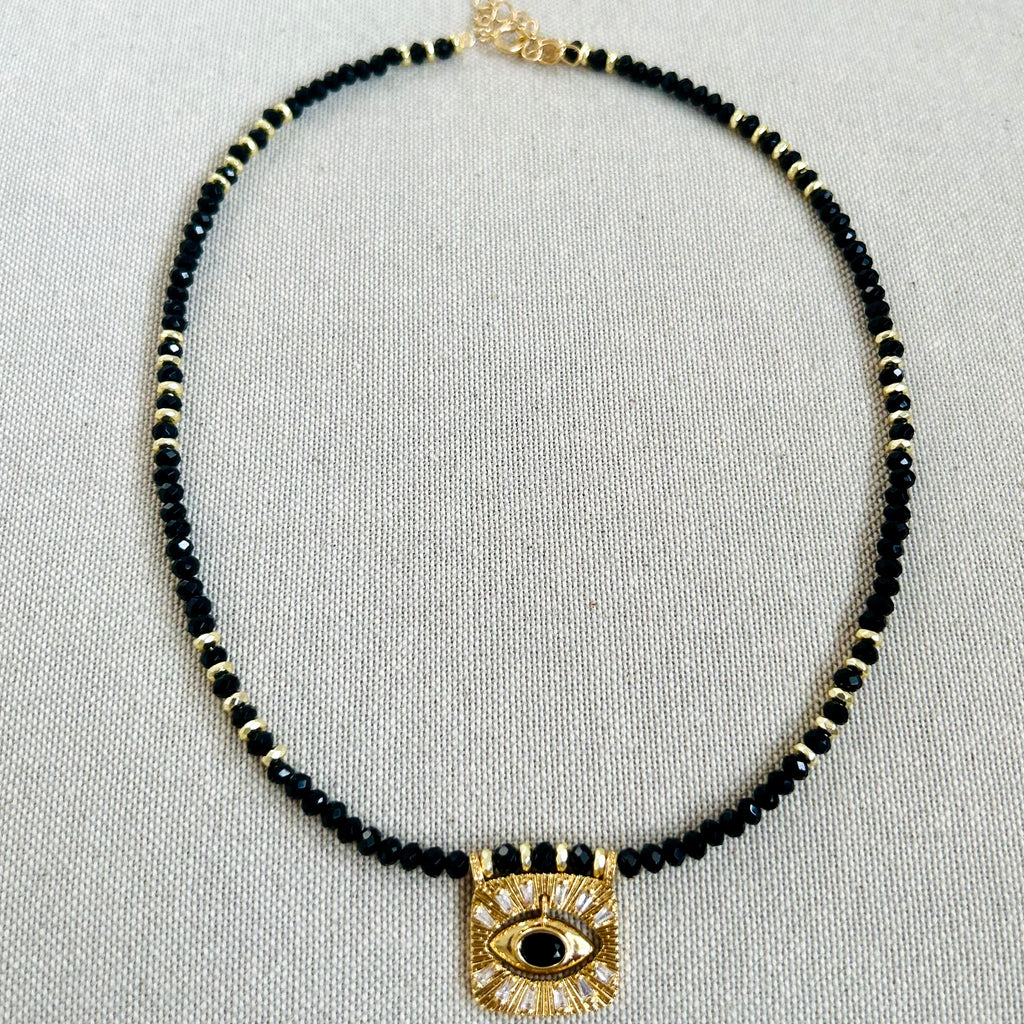 This Necklace is hand-made with 4mm Faceted Black Onyx Rondelles, 14k Gold Plated Hematite, 14k Gold Plated Square Eye Pendant with 12 delicate clear cubic Zirconium baguettes and and oval faceted one at the center of the eye.
