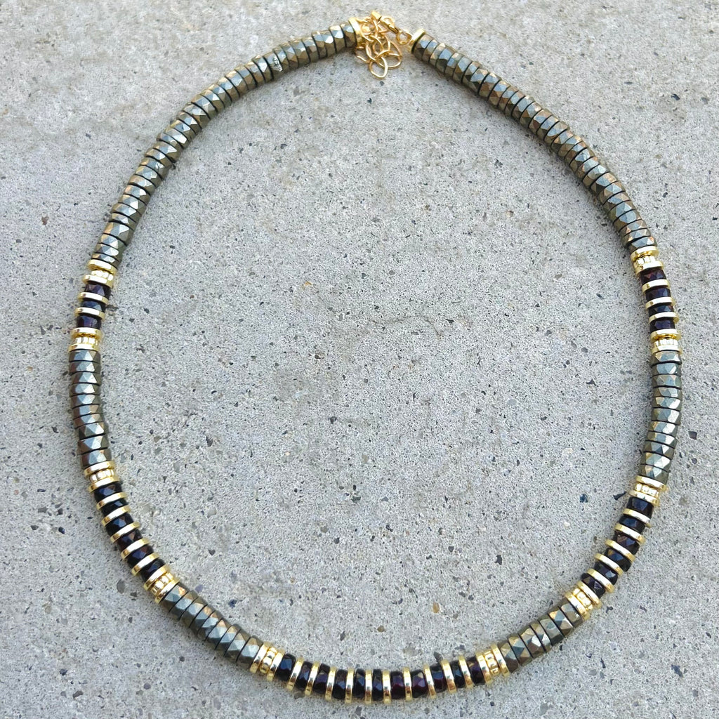 This Necklace is hand-made with Pyrite, Garnet & 18k Gold Plated Hematite Spacers.
