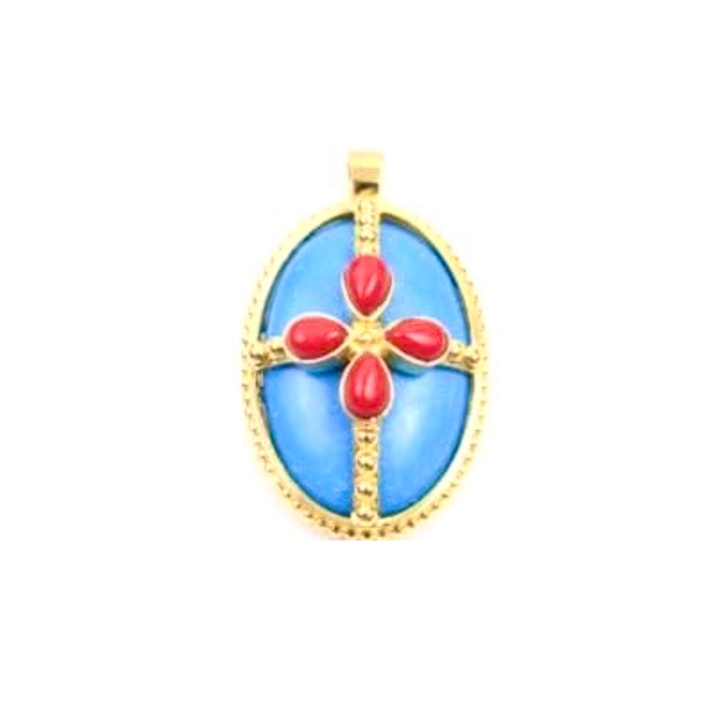 The King Henry pendant features an oval Turquoise cabochon stone, accented with four teardrop-shaped Red Coral elements at the center.