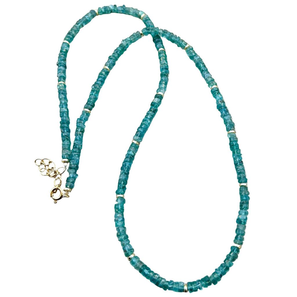 This Necklace is hand-made with 4mm heishi Apatite and 14k Gold Plated Hematite spacers.