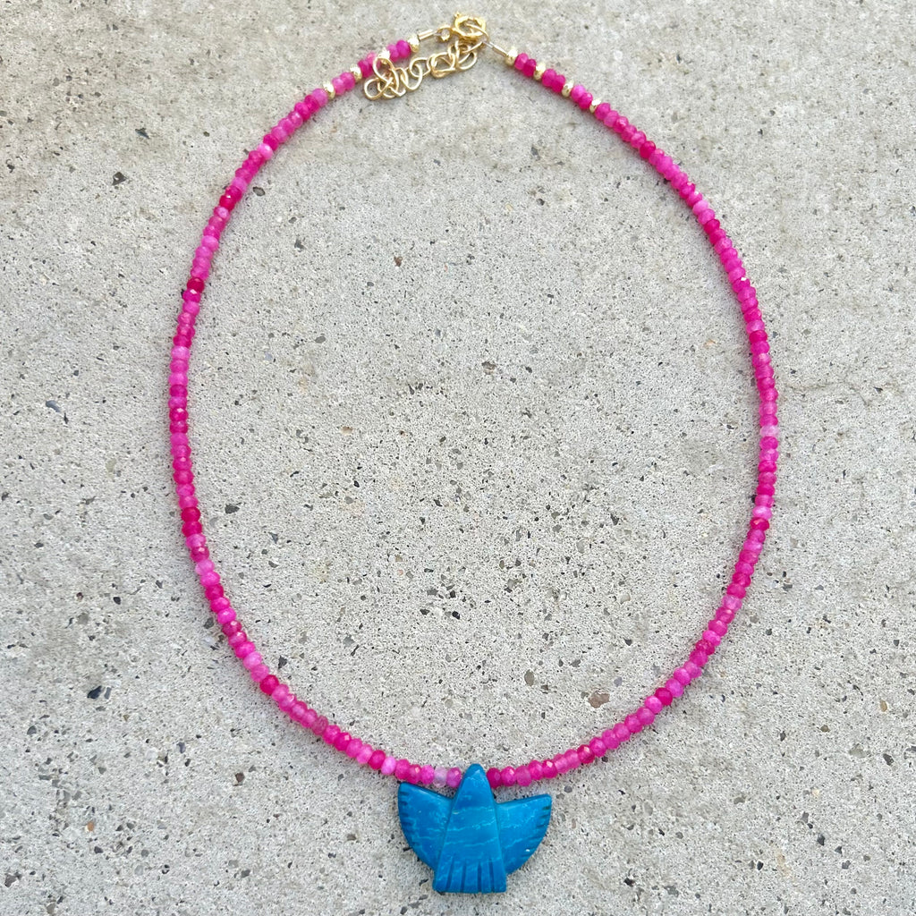 This Necklace is made with a hand carved Turquoise mini Thunderbird shape pendant (about 2.5cm wide), 2.5-3mm faceted rondelles of Bright Pink Agate.