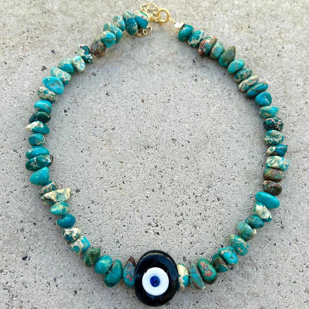 This Necklace is made with Aqua Howlite Nuggets and a center glass Traditional Black Nazar (eye) in the center.