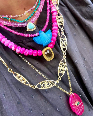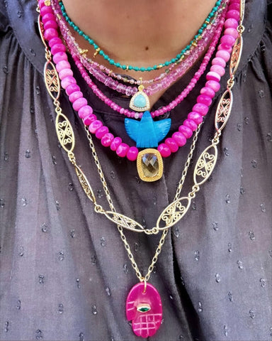 Around it, the necklace of Pink Agate radiates the gentle fire of the heart.