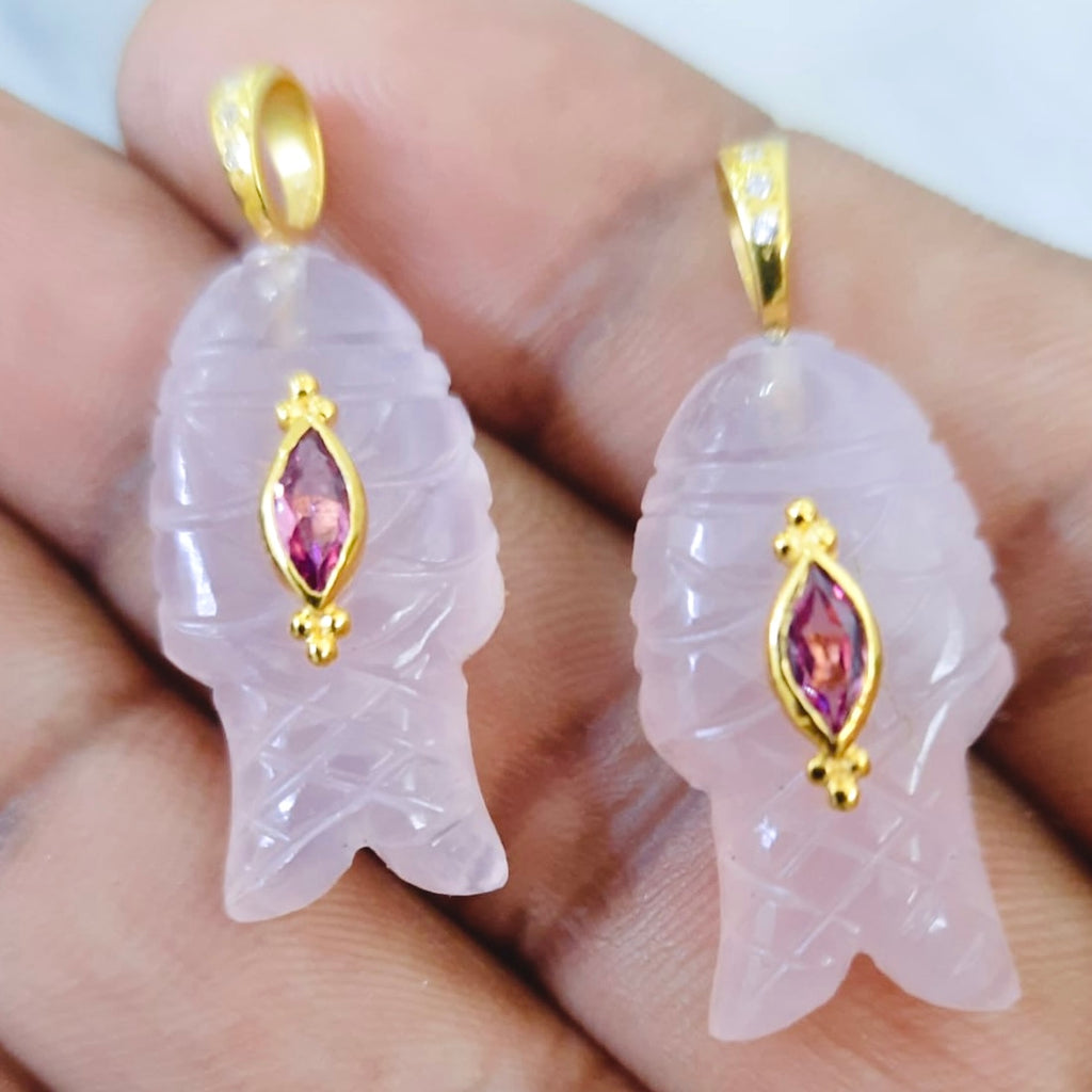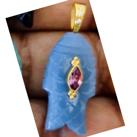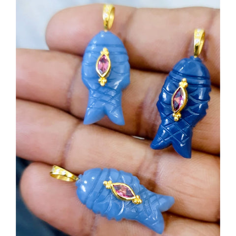 This Necklace is made with a hand carved Gem Fish shape pendant (about 2.5cm long) with a marquise shape gemstone at the center .925 Stelling Silver over hook 22k Gold pave with delicate cubic zirconium, on a 22k Gold Plated chain.