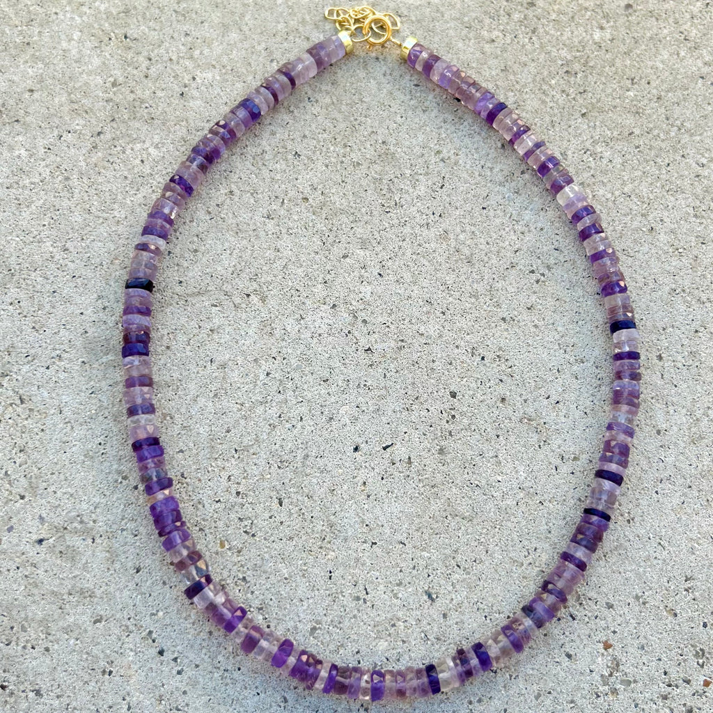 Este collar está hecho a mano con amatistas facetadas de 5-6 mm de diferentes tamaños .