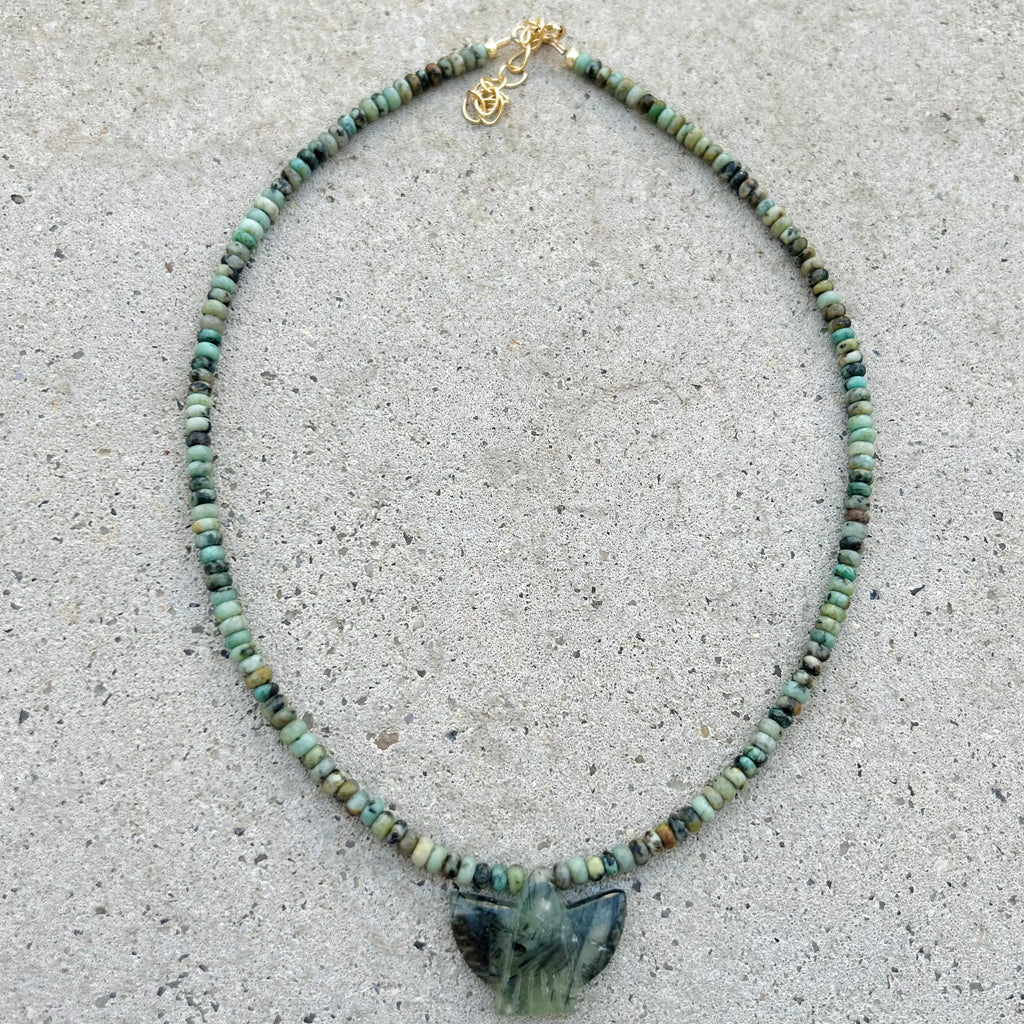 This Thunderbird in Prehnite with African Turquoise beads protects the heart and awakens the spirit to transformation.