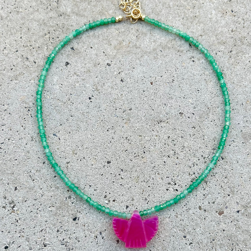 This Necklace is made with a hand carved Queen Chalcedony mini Thunderbird shape pendant (about 2.5cm wide), 2.5-3mm faceted beads of Green Onyx.