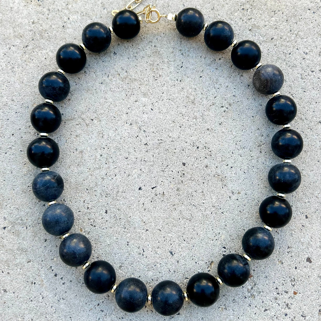 This Necklace is hand-made with 16-18mm Black Mate Agate Chunky polished round Beads & 18k Gold Plated Hematite spacers.