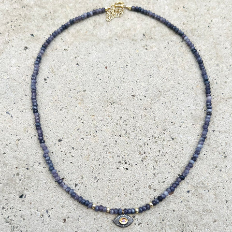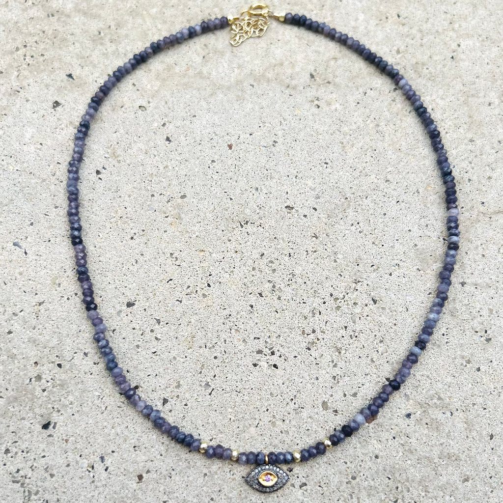 This Necklace is made 3mm faceted rondelle beads of Dumortierite, .925 sterling silver 22k Gold Plated 2 microns Diamonds Evil Eye pendant with an Amethyst at the center.