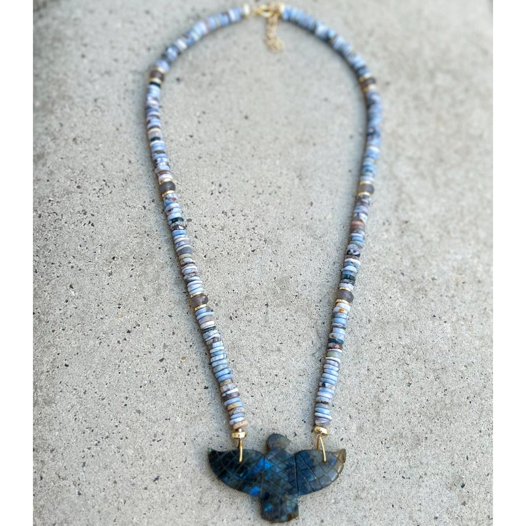 The soft blue opals bring the breath of the sky, inspiration, purity, and the shimmering beauty of divine creativity. Their changing reflections mirror the soul’s inner light. Grey jade anchors this flight, offering balance, wisdom, and the quiet strength to walk with stability even while reaching higher realms.