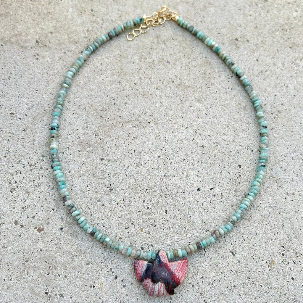 This Thunderbird in Rhodochrosite with Amazonite beads protects the heart and strengthens the spirit.