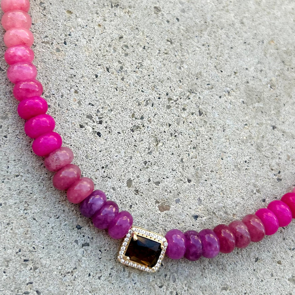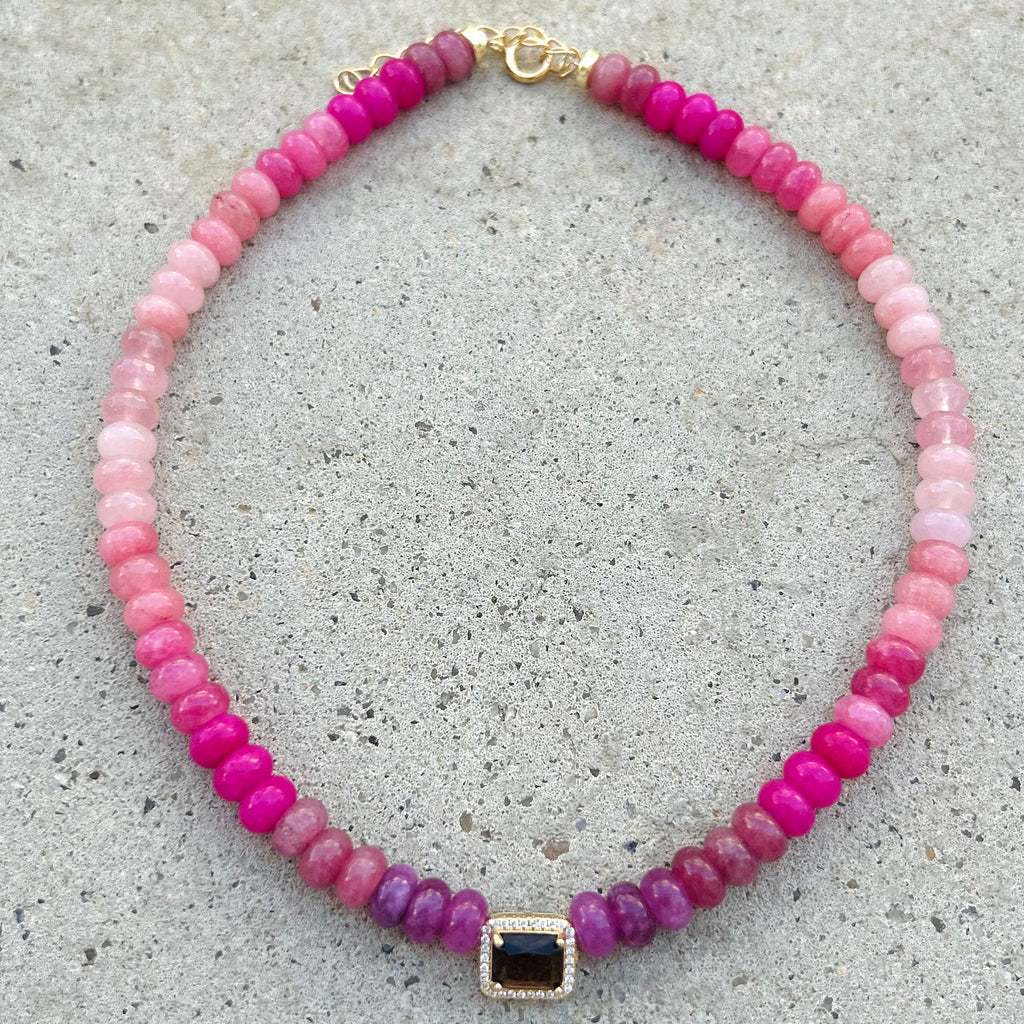 This pink jade and brown zircon necklace brings balance between passion and peace, between heaven’s tenderness and earth’s wisdom.