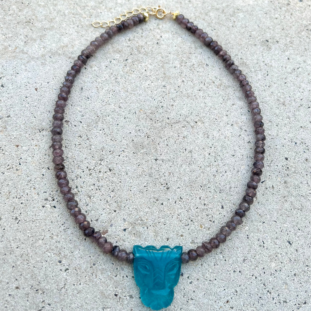This Necklace is made with a hand carved Blue Onyx Panther shape pendant (about 2.5cm wide & 3cm long), Grey Jade faceted rondelles and 14k Gold Hematite.