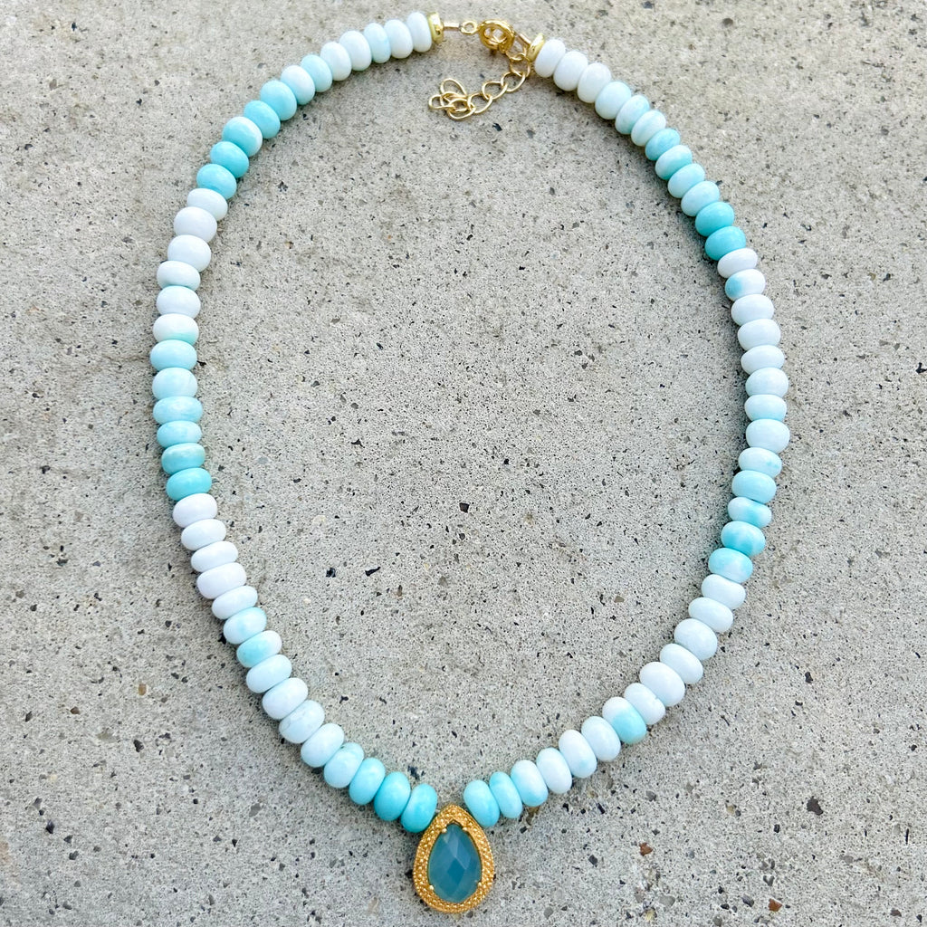 This Necklace is hand-made with 5/6mm assorted Aqua Opals rondelles & .925 sterling silver 22k Gold Plated 3 microns Amazonite cabochon teardrop Pendant.