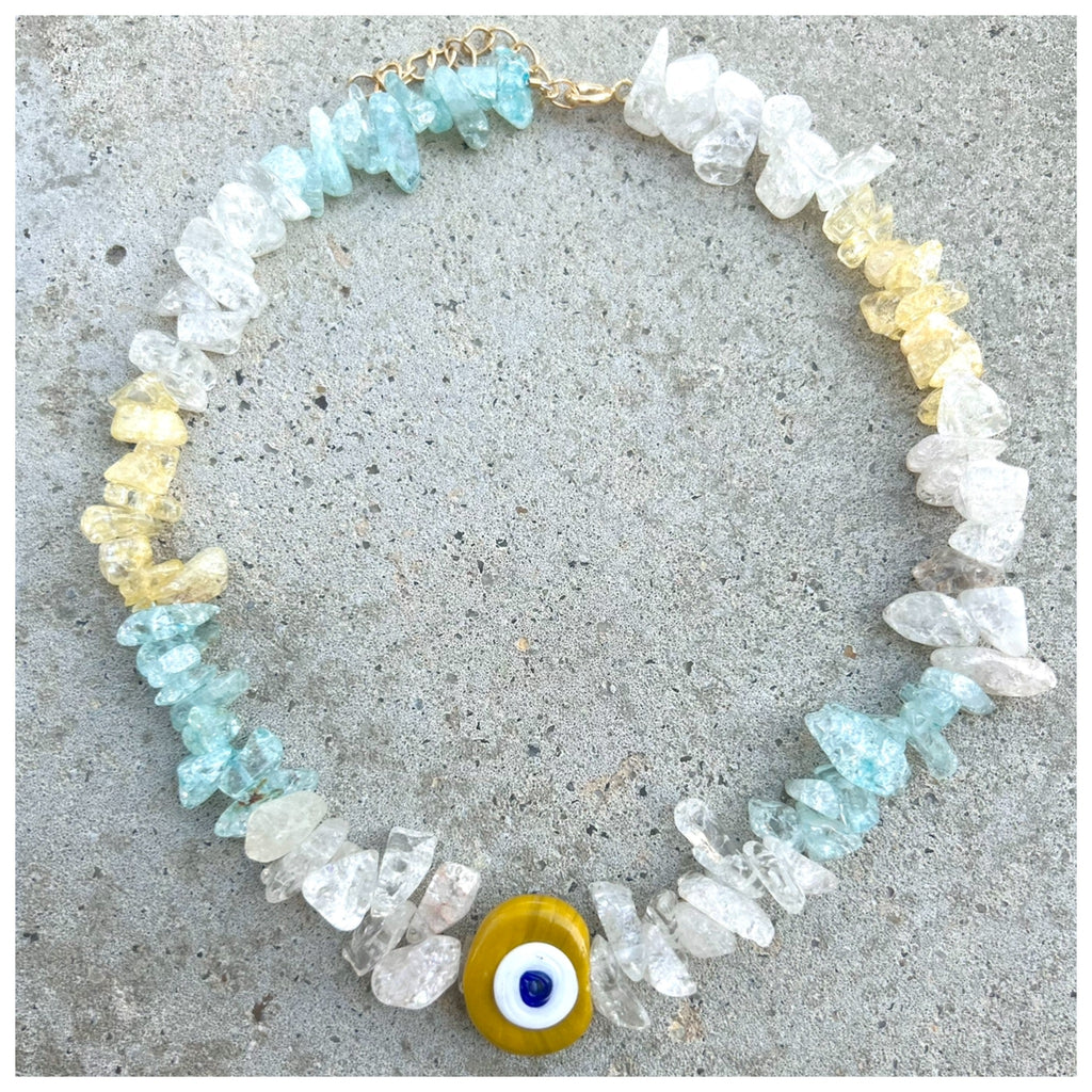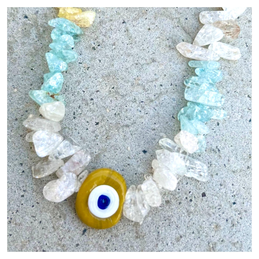 This Necklace is made with assorted Quarz nuggets and a center glass Traditional Yellow Nazar (eye) in the center.