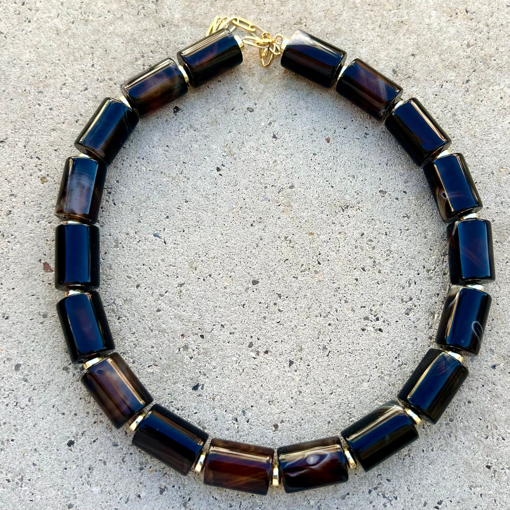 This Necklace is hand-made with assorted Black Agates tubes & 18k Gold Plated Hematite spacers.
