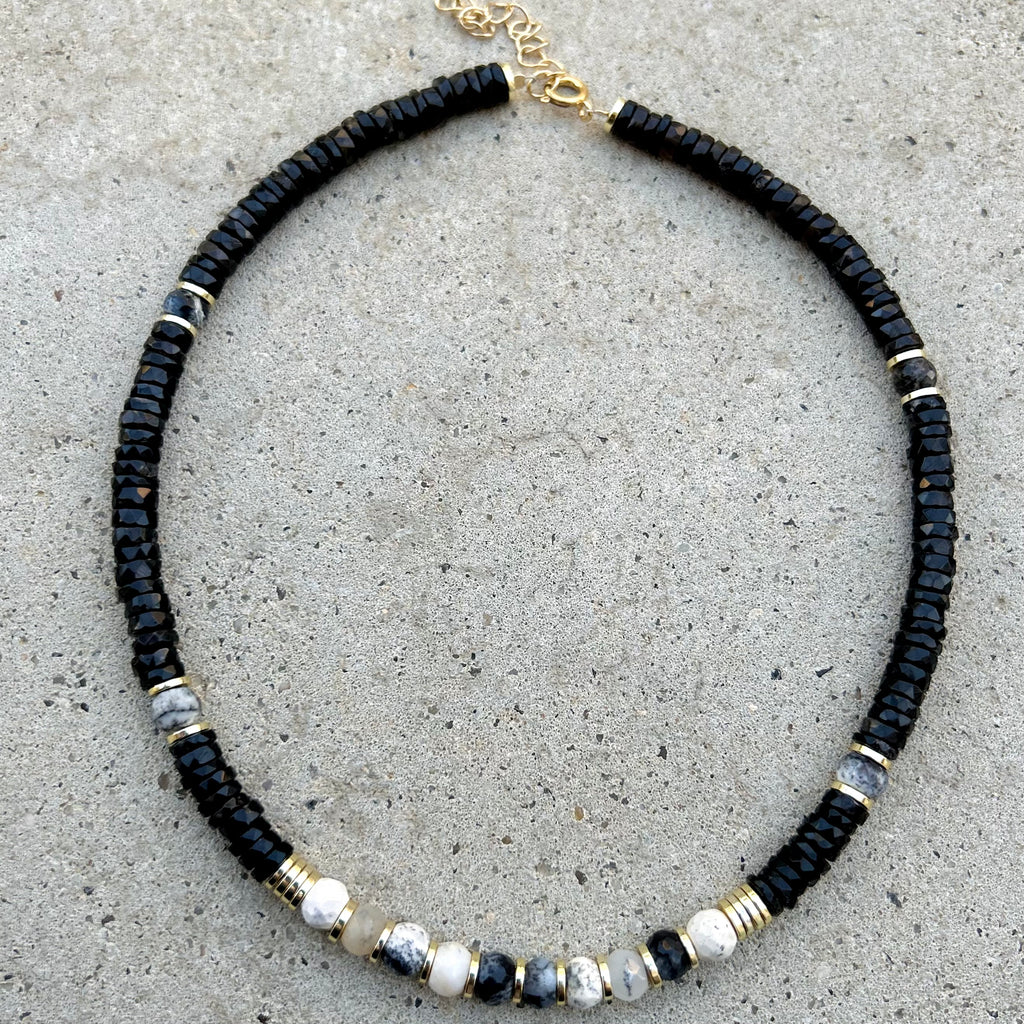 This Necklace is hand-made with faceted discs and rondelles Black Onyx, Dandrit Opals discs & 18k Gold Plated Hematite Spacers.