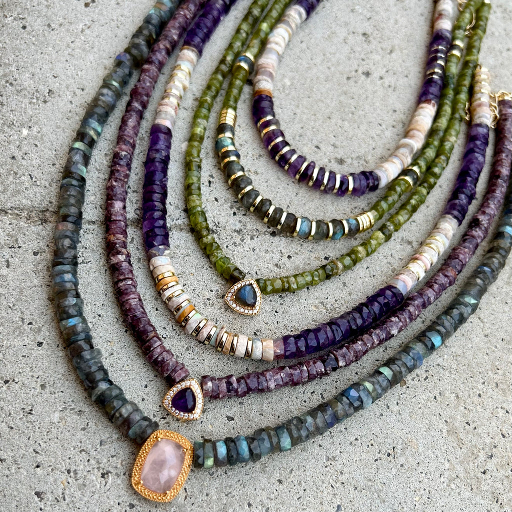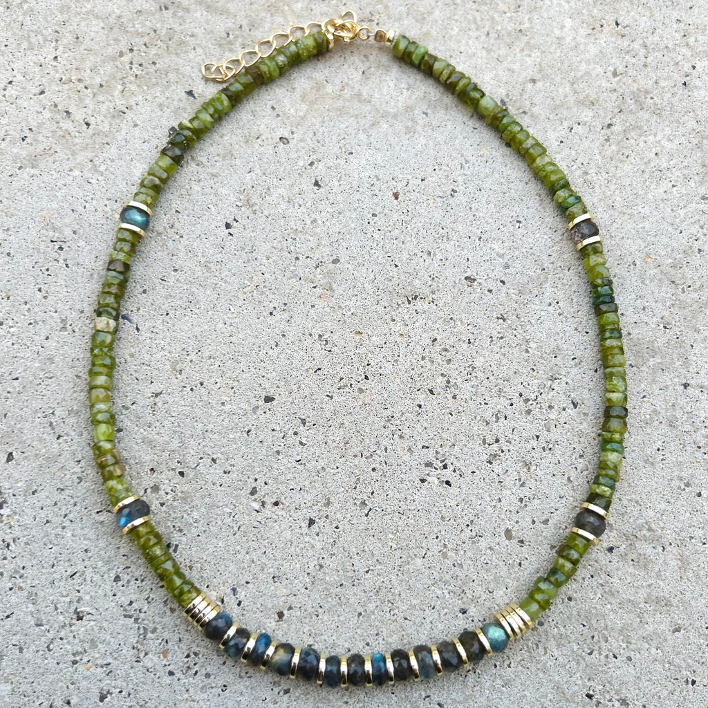 This Necklace is hand-made with faceted discs and rondelles Peridot, Labradorite discs & 18k Gold Plated Hematite Spacers.
