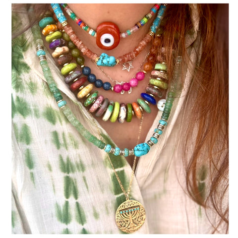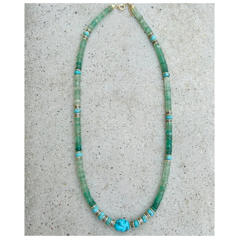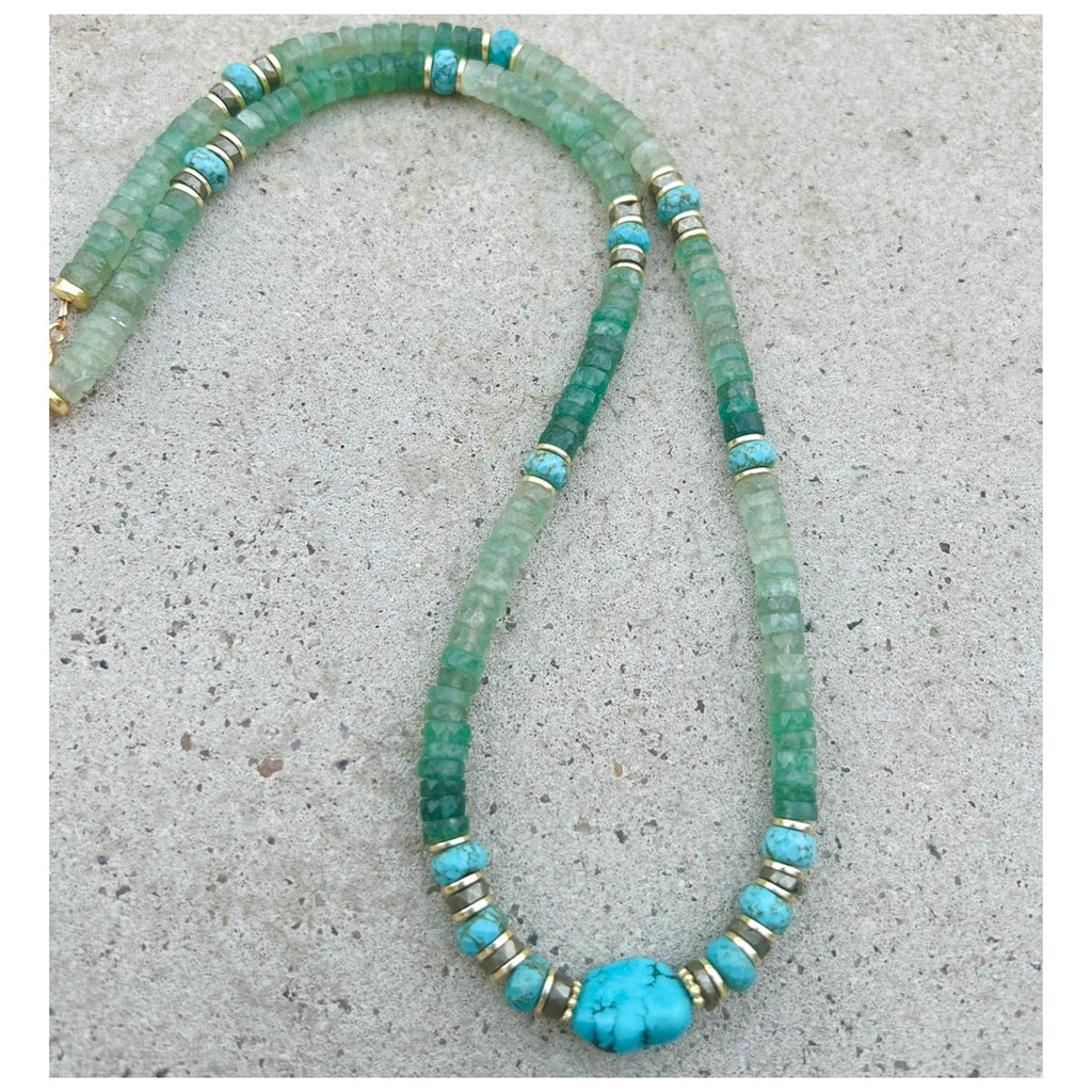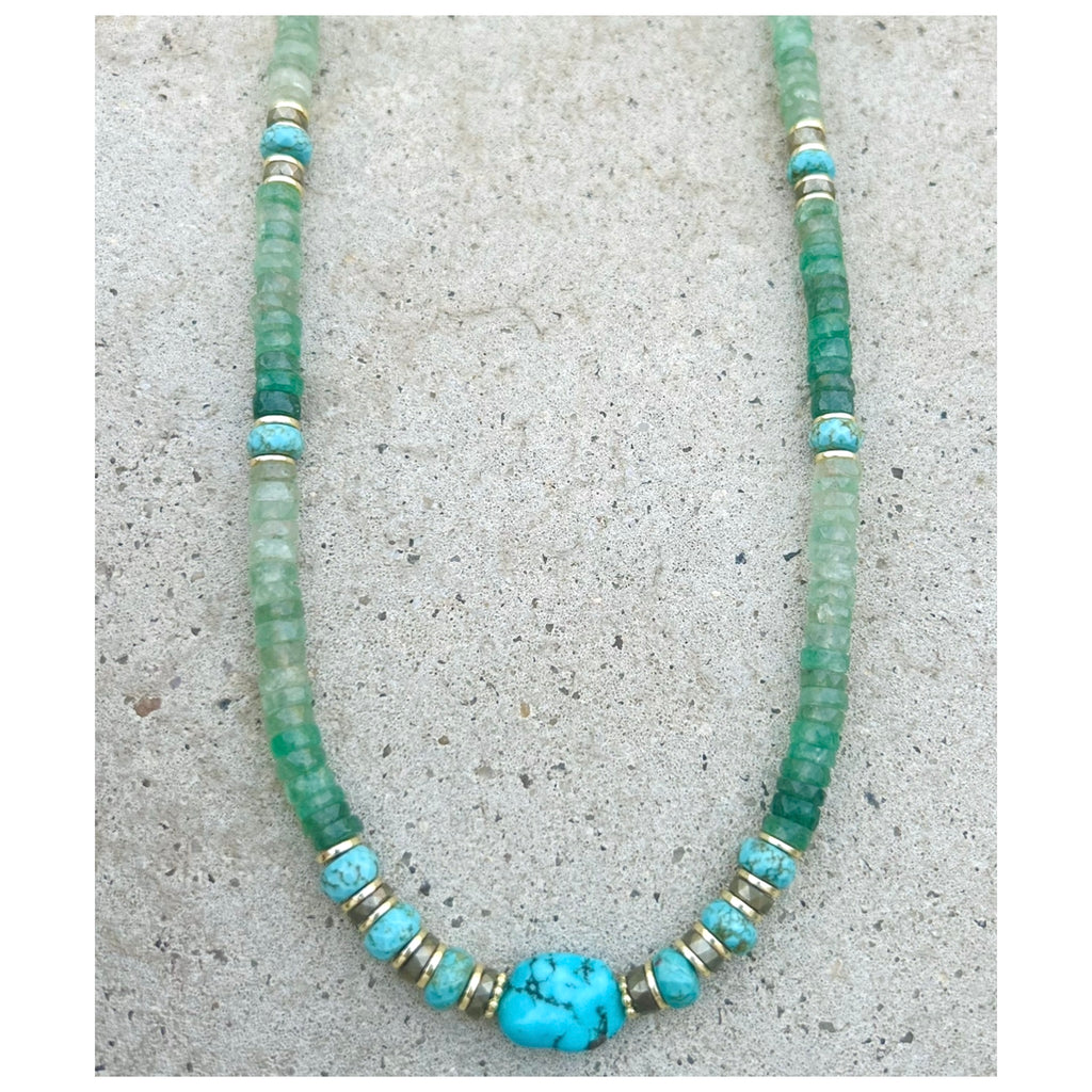 This Necklace is hand-made with 5mm faceted graduated Green Adventurine, Pyrite &  6mm faceted Turquoise rondelles , Turquoise nugget in the center and 18k Gold Plated Hematite spacers.