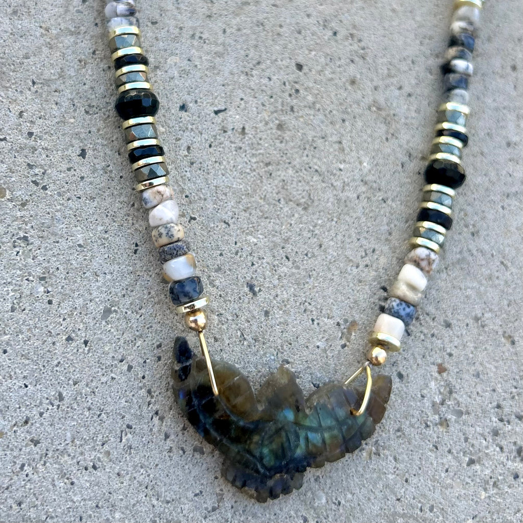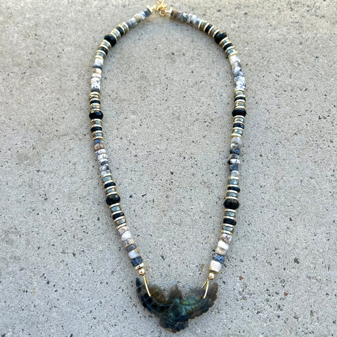 This Necklace is made with a hand carved Labradorite Phoenix shape pendant, 14k Gold Plated Hematite, Dandrit Opal, Pyrite & Black Onyx.
