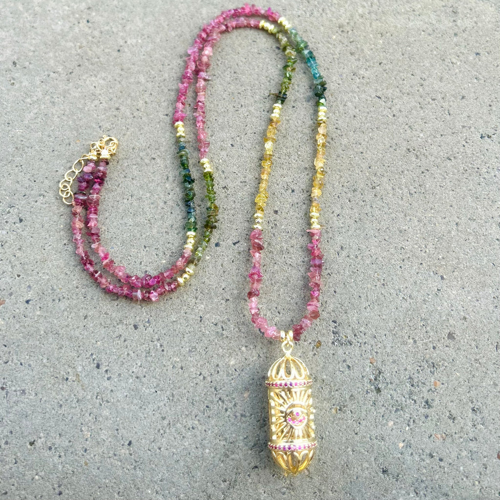 This Necklace is hand-made of assorted Tourmaline nuggets and Gold Plated Hematite, the pendant is made in Brass in 14k Gold Plated and pave with cubic meters.