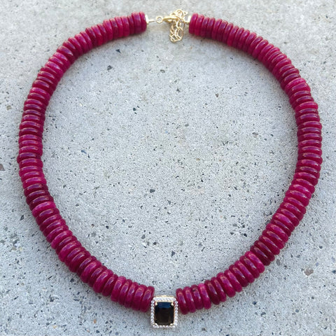 This Necklace is hand-made with 7-8mm polished Burgundy Jade discs, 18k Gold Plated and Cubic Zirconium pendant.