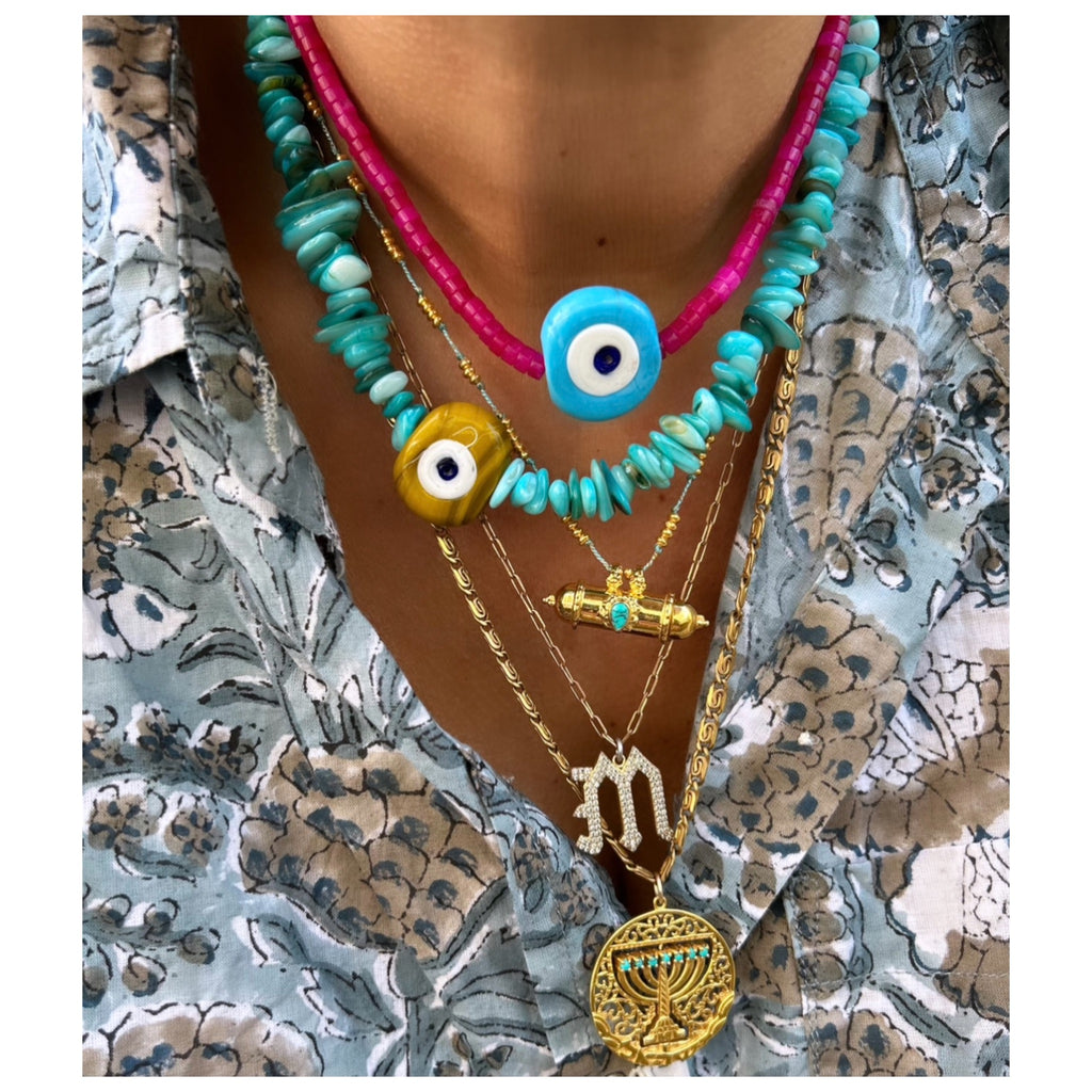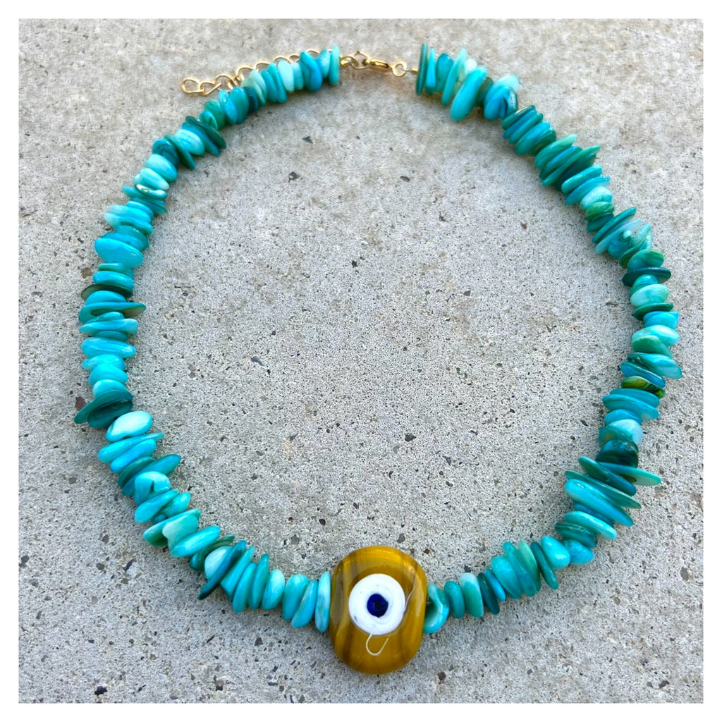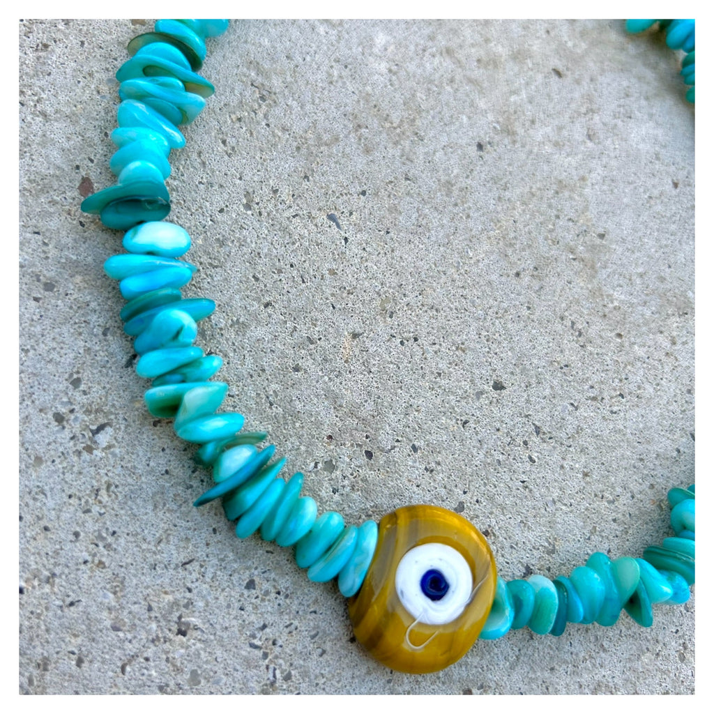 This Necklace is made with turquoise colored Abalone Shell nuggets and a center glass Yellow Nazar (eye) in the center.